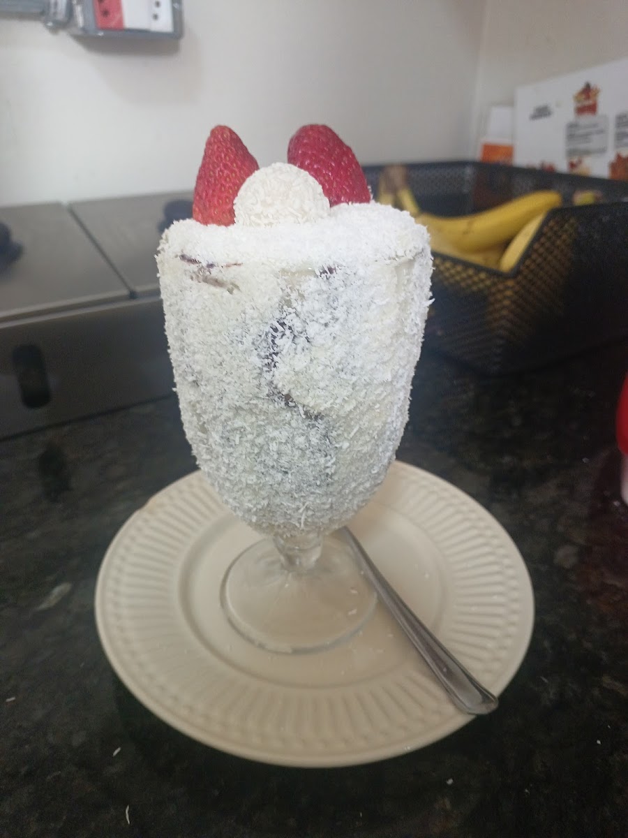 Taça gelada com sorvete ou açaí, laka cremoso, côco, morango, beijinho e raffaello montada no copo de 500ml para delivery.